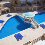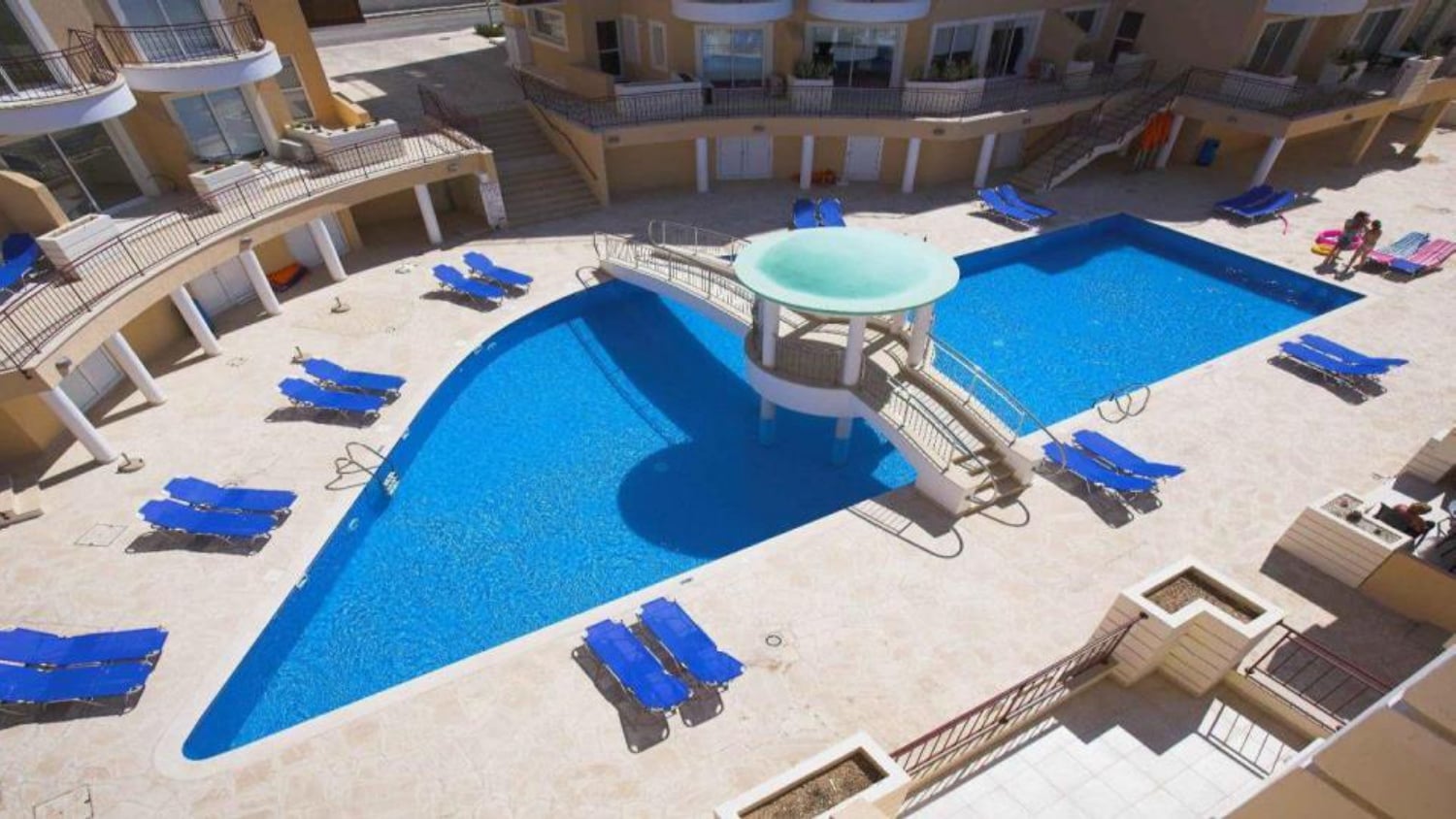 - Large communal swimming pool with sunbeds and umbrellas