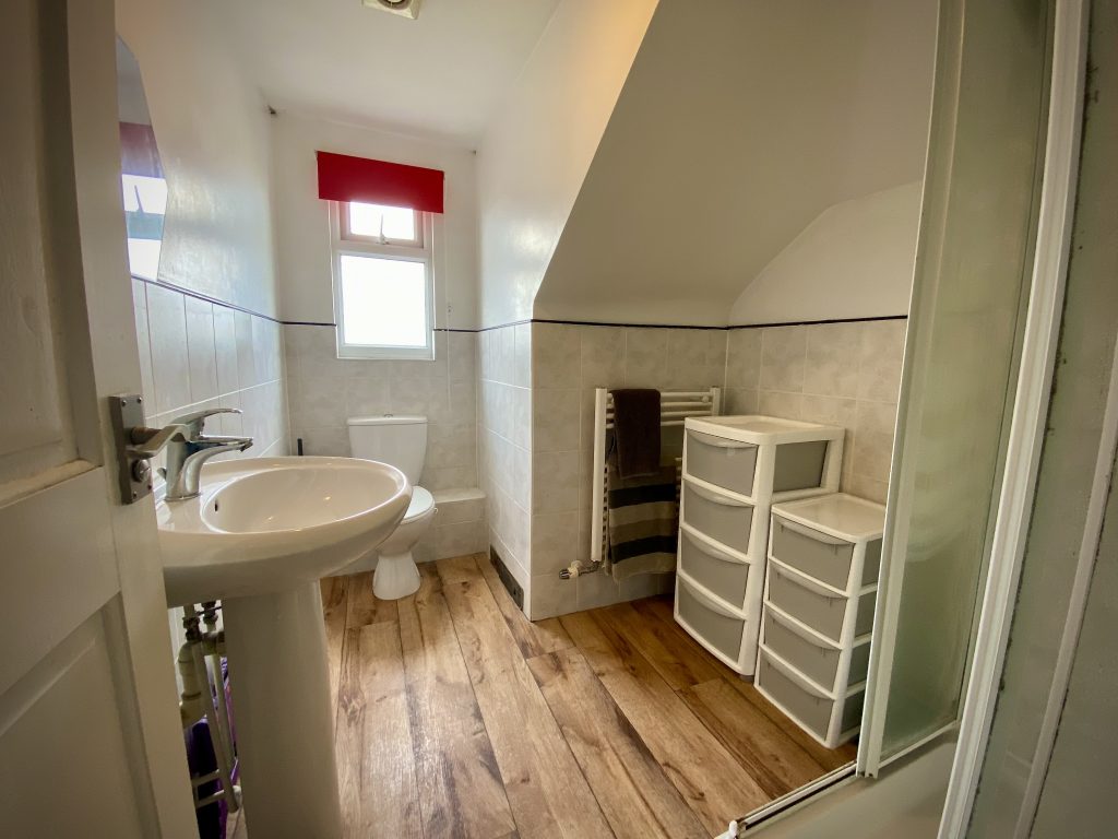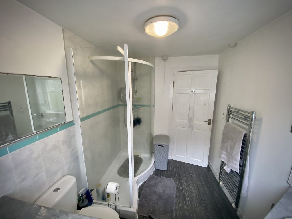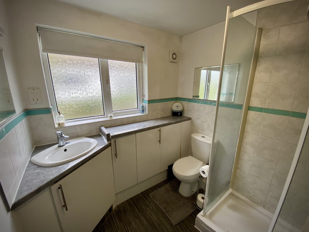 Vinyl flooring, part-tiles walls, shower cubicle with electric shower, w/c, basin, heated towel radiator, obscured upvc double glazed window, shaver point, mirror.