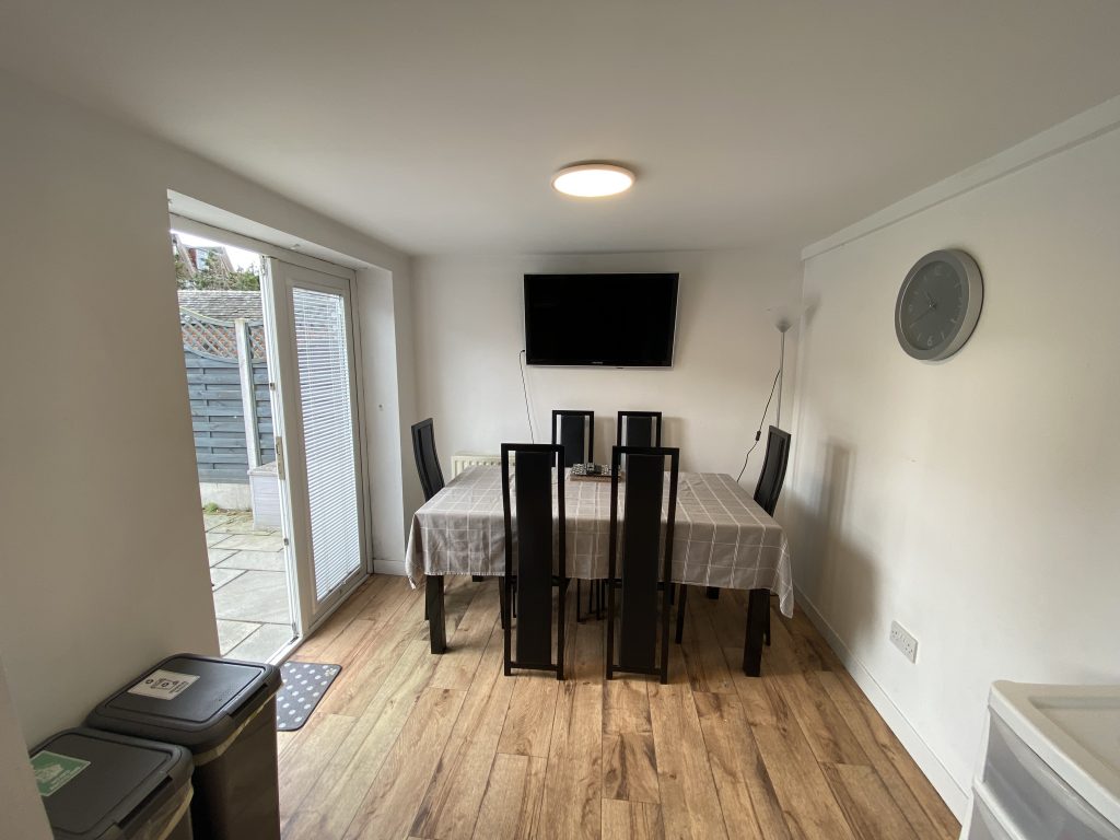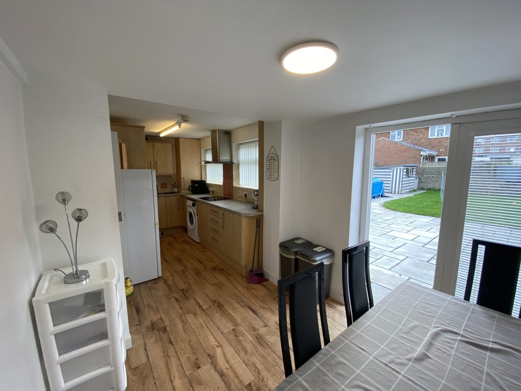 Vinyl flooring, range of wall and base units with worktop over, stainless steel one and a half bowl sink with drainer and mixer tap, cupboard housing Ideal Logic Combi c30 boiler, space and plumbing for a washing machine and a dishwasher, built in eye level double electric oven, halogen hob with wall mounted extractor hood over, space for a freestanding fridge freezer, ceiling mounted light, two upvc double glazed windows to the rear, opening to dining area with space for a table and chairs, radiator, ceiling mounted light, upvc double patios doors opening to the rear garden.