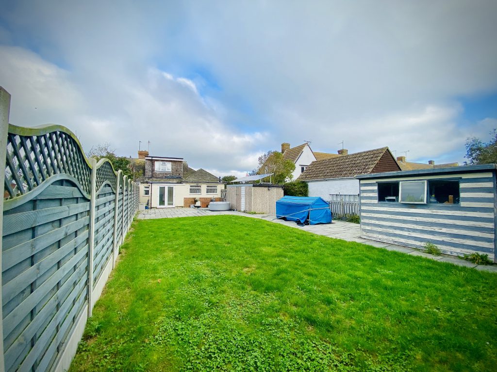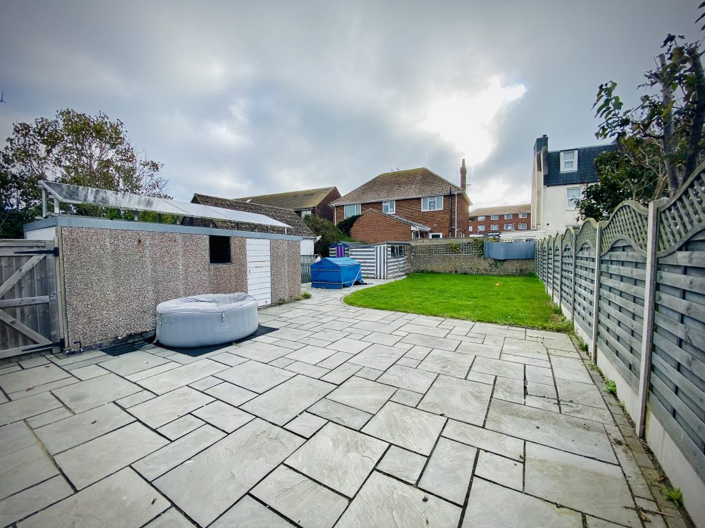 Mainly laid to patio with an area of grass, garage with solar panels with side access, shed, outside power socket, outside tap, double gate to side of property.